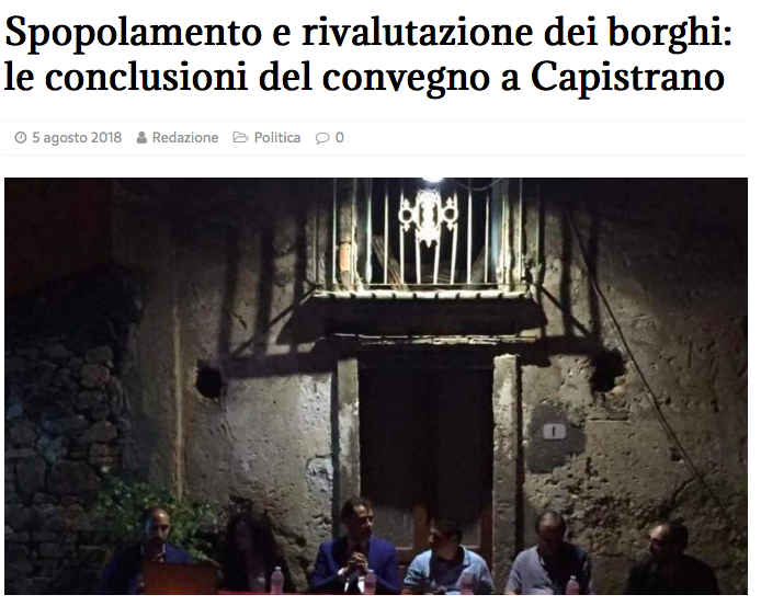 Spopolamento e rivalutazione dei borghi: le conclusioni del Convegno a Capistrano, Il Meridio, 5 Agosto 2018 Published 18 agosto 2018 at 694 × 553 in Competenze – Riconoscimenti – Rassegna Stampa Mi piace Caricamento...